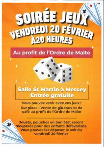 Vendredi 20 Février 2026 : Soirée jeux, l’Association L’Ordre de Malte organise une soirée jeux de sociétés et vous donne rendez-vous à la salle polyvalente à 20h – entrée gratuite